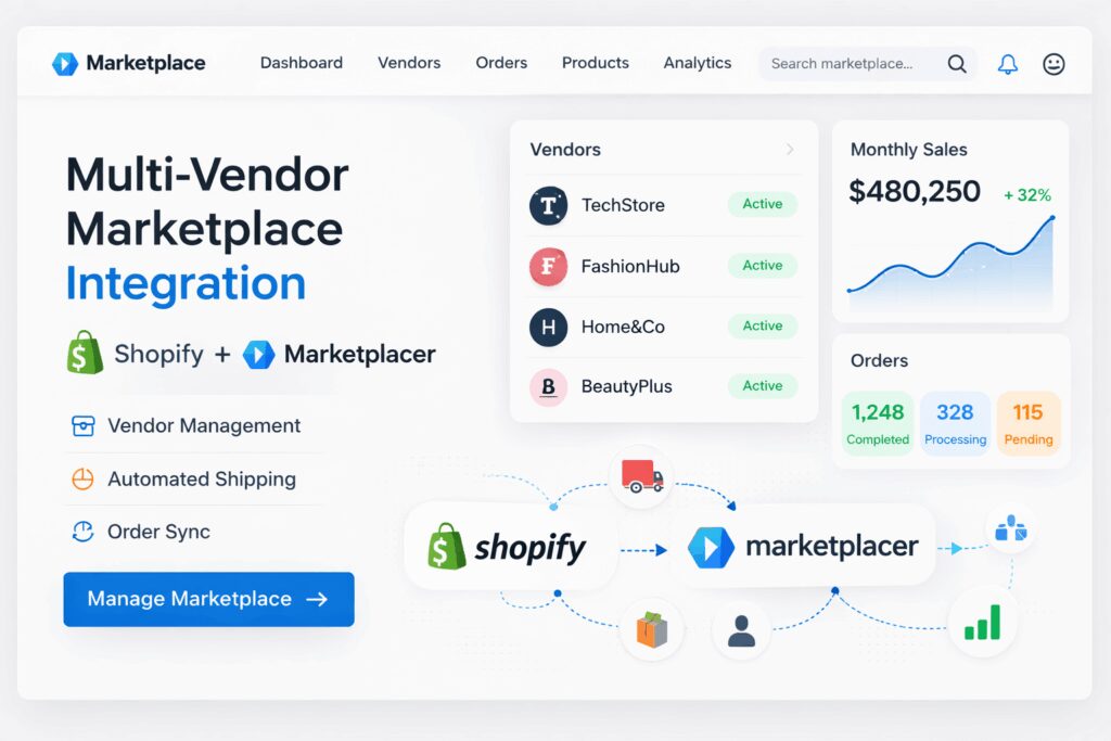 Integration between Shopify and Marketplacer enabling a scalable multi-vendor marketplace with automated shipping, seller management and synchronized order workflows.